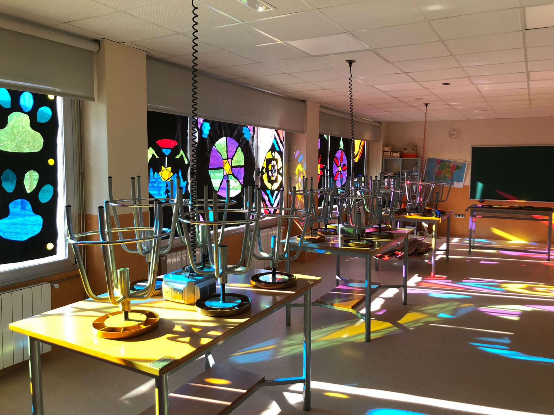 In the last few weeks we have developed a multidisciplinary project in the subjects of Art and Geography & History. The project consisted in designing stained glass with the objective of reducing the effect that the light produces when it goes through different stained glass colours. The final result is a space that is full of light and colourful effects that reminds one of the great gothic cathedrals.